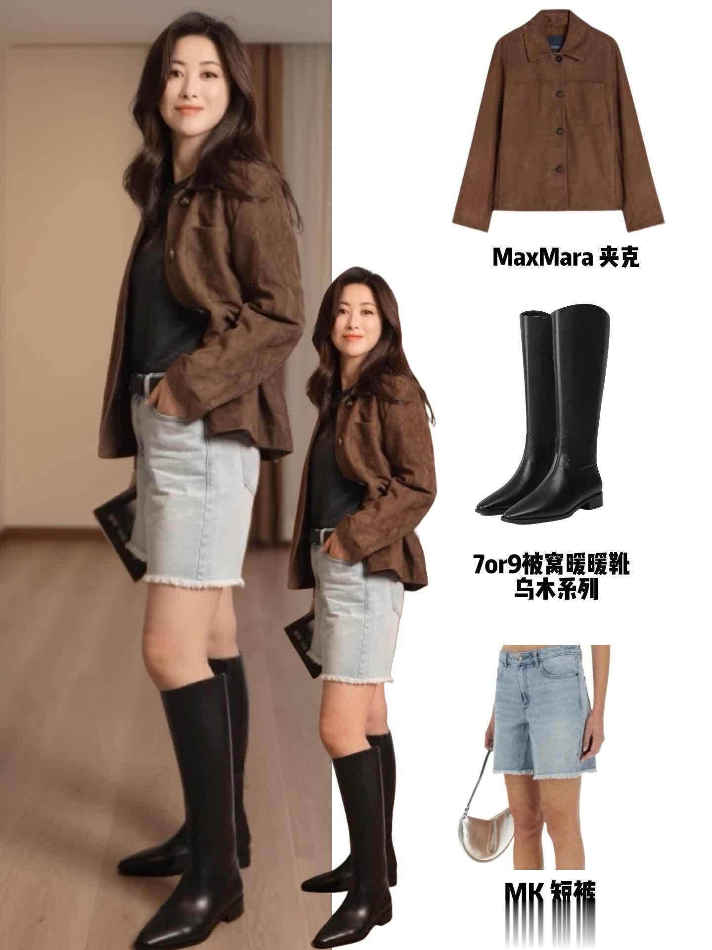 先说Look1的美拉德夹克,简直是“都市摩登模板”!深棕带点焦糖调的夹克,版型是那种不松不紧的利落款,袖口随意卷起来露出里面的白色内搭,层次感一下子就出来了。下身配的黑色紧身裤,把腿衬得又直又细,最绝的是那双骑士靴,靴筒刚好到大腿根,走路时轻轻晃,自带“姐不好惹”的气场。她站在街边抬手撩头发的时候,阳光洒在夹克的光泽感面料上,高级得像老电影里的复古女郎,这一套上班穿气场全开,下班去看展也完全hold住,实用性和颜值都在线~